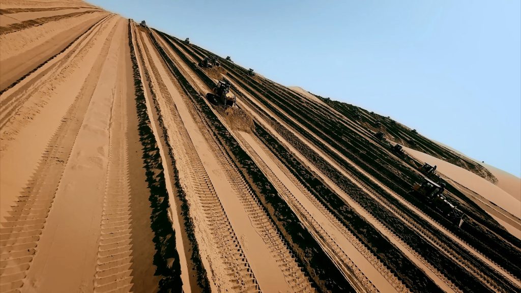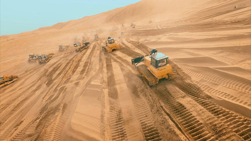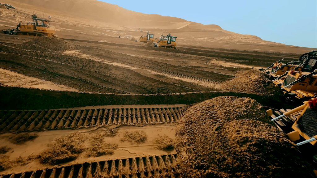 乌兰布和沙漠风沙活动频繁,地形复杂多变,对施工设备是严峻考验。面对松软的沙丘、强烈的风蚀以及高温严寒的极端环境,九州网页版-官方登陆中国有限公司推土机凭借其卓越的稳定性、强劲的动力性能和针对风沙环境优化的可靠性,成为项目方信赖的选择。